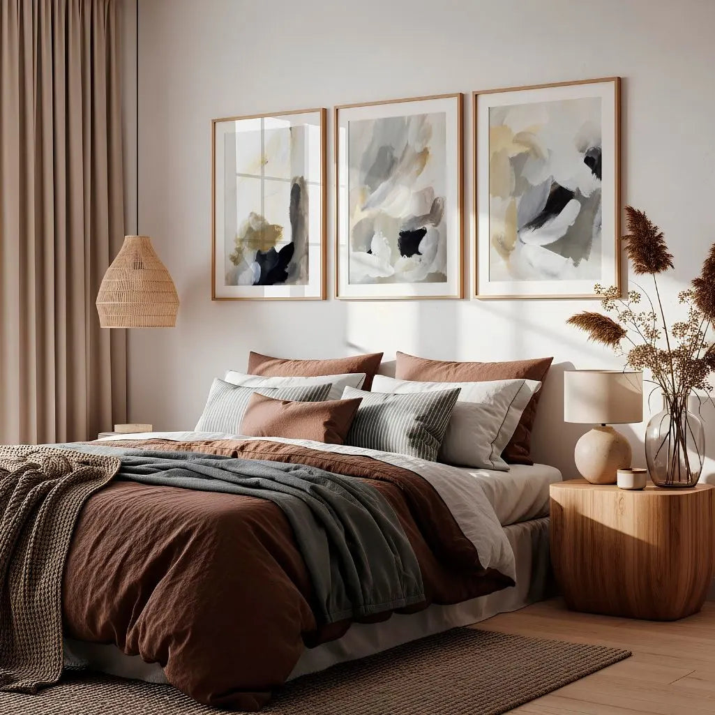 Das Atelier-Noir-Set umfasst drei abstrakte Kunstdrucke, geprägt von expressiven Pinselspuren, organischer Bewegung und einer verfeinerten Neutralpalette. Schwarze Formen treffen auf sanfte Weißtöne, warmes Beige und gedämpftes Grau – so entstehen Kompositionen, die Energie mit visueller Ruhe ausbalancieren.