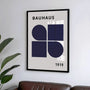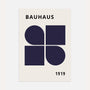Dieses Bauhaus-Poster von 1919 greift die Essenz modernistischer Schlichtheit und ausgewogener Gestaltung auf. Tiefes Marineblau auf hellem Hintergrund wirkt geordnet, funktional und klar – ganz im Sinne der Bauhaus-Idee.