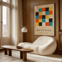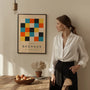 Dieses Poster im Bauhaus-Stil zeigt eine ausdrucksstarke, farbige Komposition mit klarer Struktur. Kräftige Töne in Blau, Rot, Gelb und Schwarz wirken lebendig und zugleich geordnet und verbinden Präzision mit künstlerischer Wirkung.