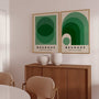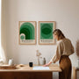 Die runden und bogenförmigen Elemente verleihen den Kompositionen Rhythmus und Harmonie, während der neutrale Hintergrund die Intensität des Grüns hervorhebt. Dieses Set passt perfekt zu minimalistischen, skandinavischen, Retro- und modernistischen Einrichtungsstilen. Ideal für Wohnzimmer, Büro, Atelier oder Schlafzimmer.