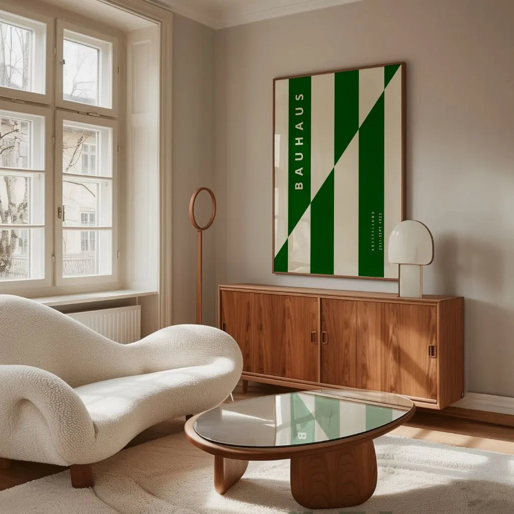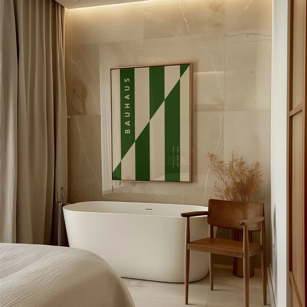 Dieses Poster im Bauhaus-Stil kombiniert tiefes Grün mit weichem Beige zu einer minimalistischen Mischung aus Harmonie und Energie. Ein Streifenrhythmus mit markanter diagonaler Unterbrechung wirkt dynamisch und zugleich geordnet und betont Kontrast sowie visuelle Struktur.