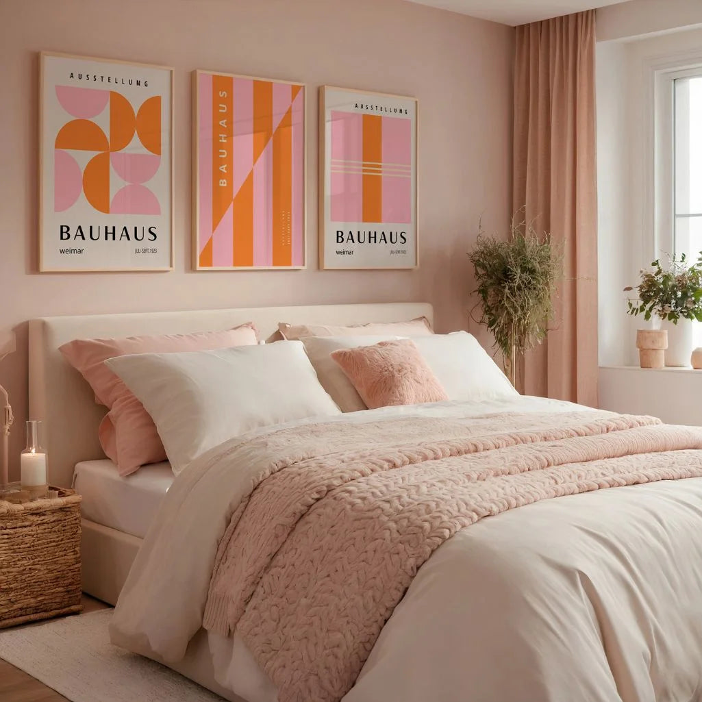 Das Bauhaus-Poster-Set aus 3 Stück „Energie der Farbe Weimar“ ist eine ausdrucksstarke, dynamische Interpretation des Bauhaus-Stils, die auf dem starken Kontrast von intensivem Pink und Orange basiert. Geometrische Streifen, Halbkreise und diagonale Linien schaffen eine moderne, energiegeladene visuelle Komposition.
