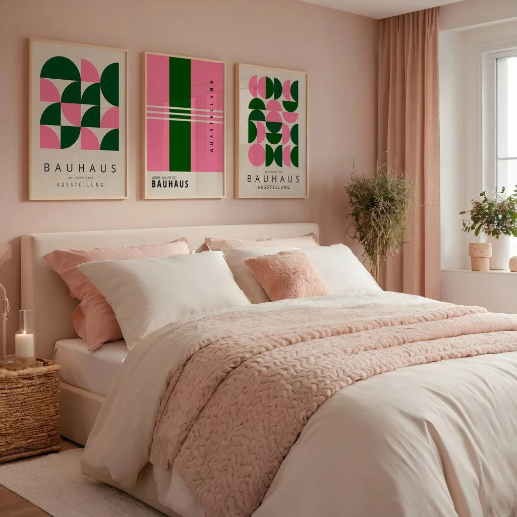 Die Verbindung von sattem Pink mit tiefem Grün verleiht den Postern Energie und Modernität und bewahrt zugleich den Bezug zu den historischen Bauhaus-Ausstellungen in Weimar. Jedes Poster wirkt für sich, zusammen bilden sie jedoch ein stimmiges, sammlerwürdiges Gesamtbild mit einem klaren dekorativen Charakter.