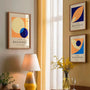Die Kombination aus warmem Orange und Creme mit tiefem Marineblau sowie einem Akzent in Hellblau verleiht den Postern einen energischen und zugleich ausgewogenen Charakter. Das Set bringt Leichtigkeit, Rhythmus und visuelle Frische in den Raum und bewahrt dabei eine minimalistische Ästhetik.