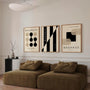 Das Bauhaus-Poster-Set aus 3 Stück „Stille der Form Weimar“ ist eine ausgewogene Kollektion, die auf dem Kontrast von hellem Beige und tiefem Schwarz basiert. Das Set nutzt klare Körperformen, rhythmische Gliederungen und sanfte Übergänge der Formen und schafft so eine Komposition mit ruhigem, architektonischem Charakter.