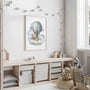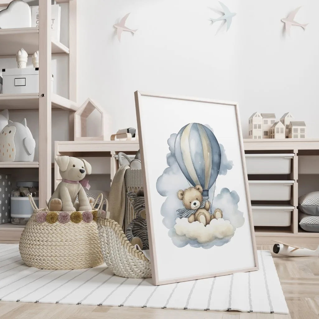 Ein bezauberndes Kinderposter mit einem Teddybären, der auf einem Ballon zwischen sanften Aquarellwolken schwebt. Die zarte Farbpalette aus Blau- und Beigetönen schafft eine ruhige, gemütliche Atmosphäre – perfekt fürs Babyzimmer, Kindergartenzimmer oder die Schlafecke. Dieses Poster im Aquarellstil passt ideal zu skandinavischen, Boho- und modernen Kinderzimmern, während das minimalistische Design der Wand eine leichte Note verleiht. Eine perfekte Geschenkidee zur Babyparty, Geburt oder zum ersten Geburtstag.
