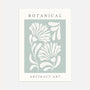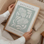 Ein zartes botanisches Poster im abstrakten Kunststil mit leuchtenden, dekorativen Blüten vor einem kühlen, salbeigrünen Hintergrund. Die vereinfachten Pflanzenformen erzeugen eine leichte, moderne Komposition, die dem Raum Ruhe und Frische verleiht. Die zurückhaltende Farbpalette macht das Poster passend für Japandi-, skandinavische, Boho- und minimalistische Einrichtungen, während das typografische Layout einen Galerie-Effekt erzeugt.