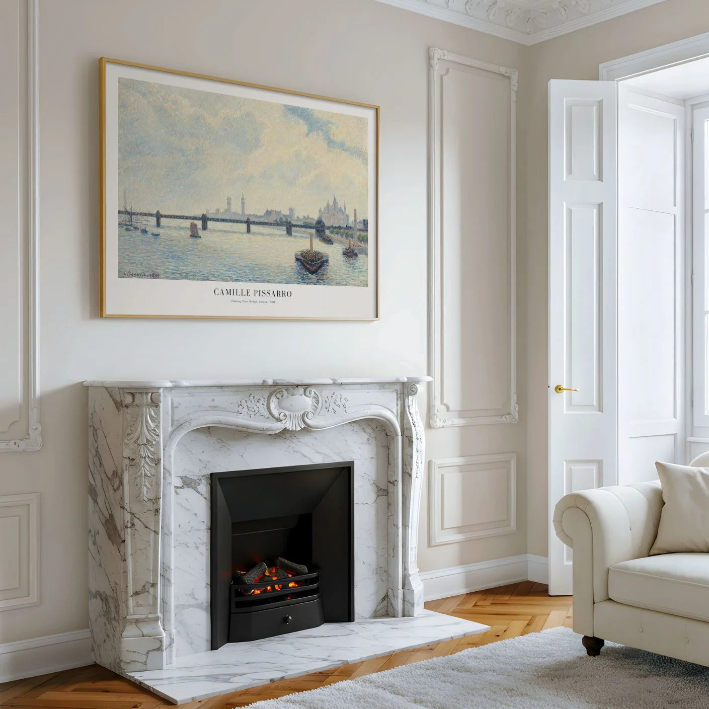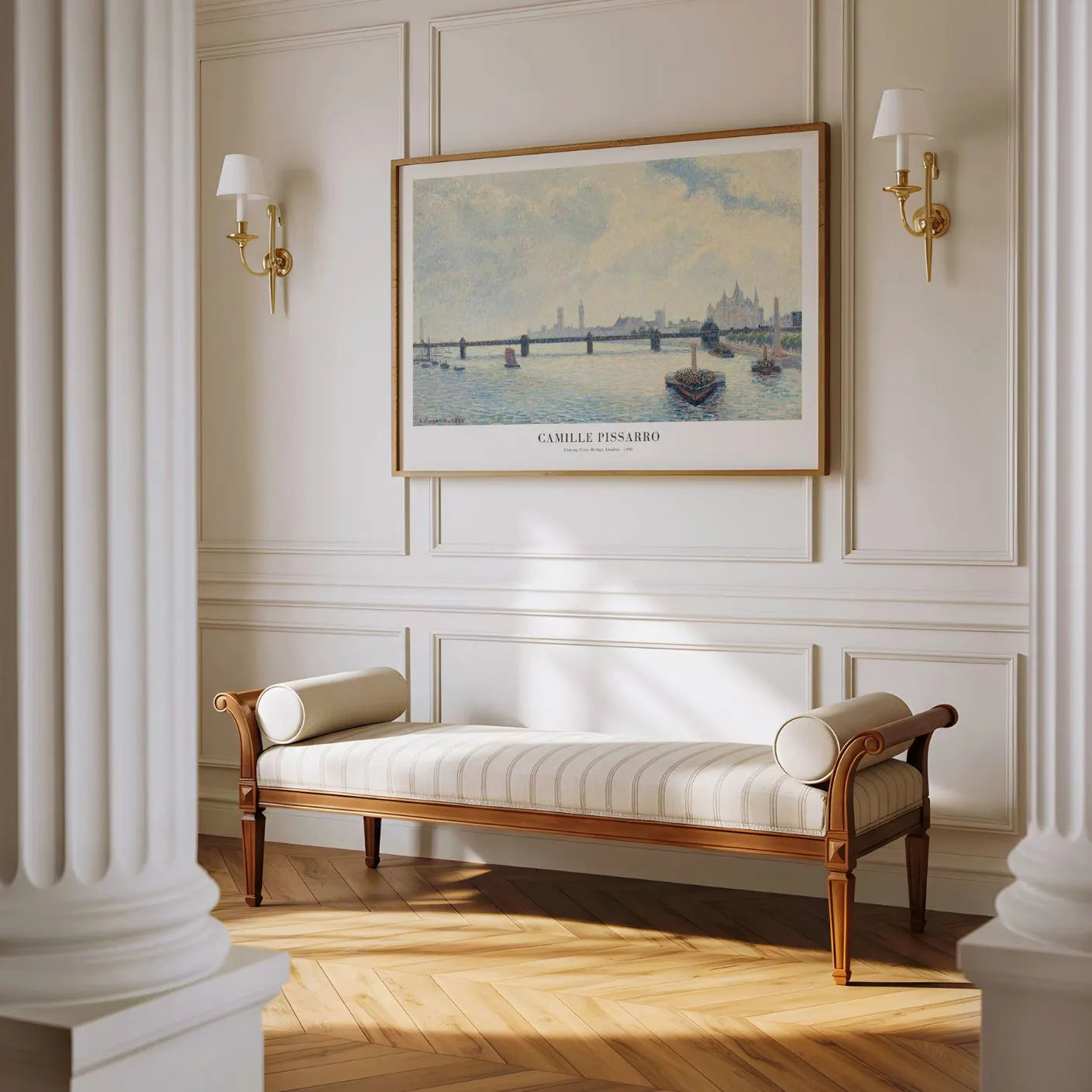 Mit „Charing Cross Bridge, London“ verwandelt Camille Pissarro die Großstadt in eine stille, atmosphärische Szene. Die Themse liegt in feinem Nebel, während Licht und Reflexe eine ruhige, fast meditative Stimmung erzeugen.