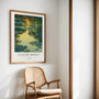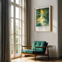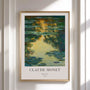 Goldene Sonnenakzente ziehen sich durch kühle Grün- und Blautöne und schaffen Tiefe sowie eine ruhige, warme Stimmung. Claude Monet arbeitet hier weniger mit Form als mit Atmosphäre – weich, immersiv und still.