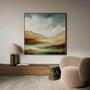 „Grünes Tal“ zeigt eine offene Landschaft mit sanften Hügeln und weiter Tiefe. Gedämpfte Grüntöne und warme Beigeschattierungen schaffen eine natürliche, ausgeglichene Atmosphäre.