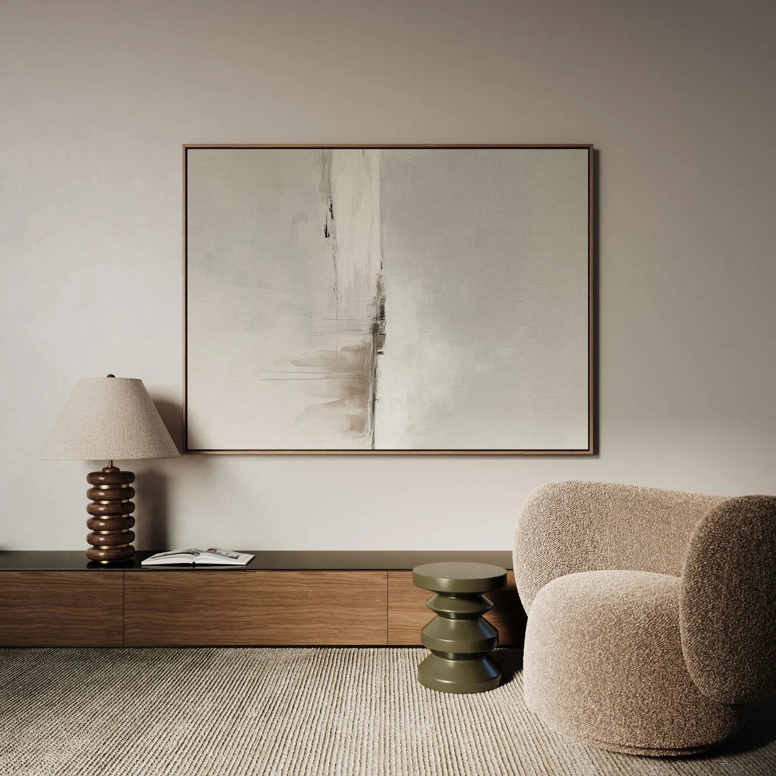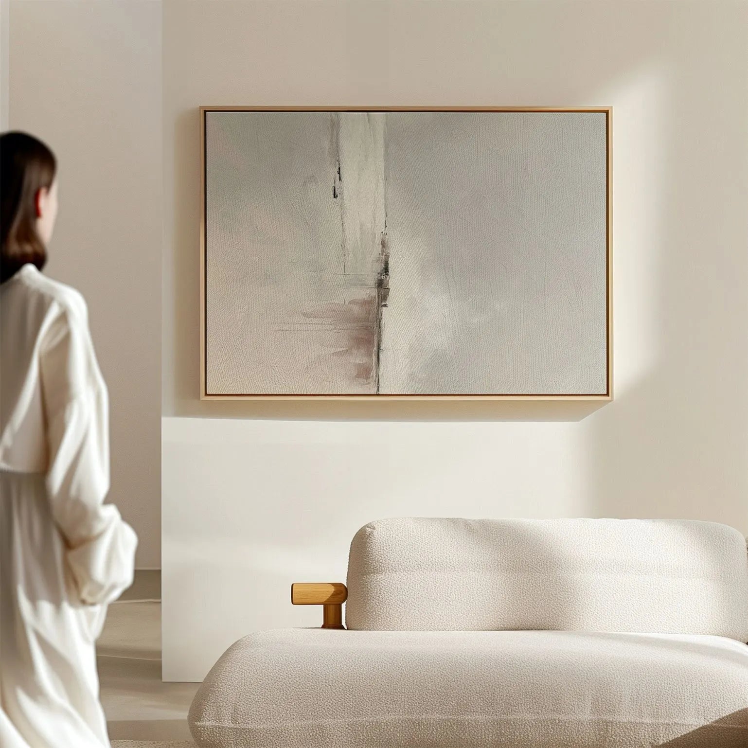 Dieses gerahmte Leinwandbild passt ideal zu Japandi-, Scandi- und modern-organischen Interieurs. Es ergänzt neutrale Farbwelten mit leiser Tiefe und zeitloser Gelassenheit.