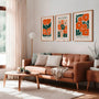 Jedes Poster zeigt abstrakte, ausgeschnittene Formen von Blumen und Blättern, aufgebaut aus weichen, fließenden Konturen und rhythmischen Linien. Die Farbpalette basiert auf warmem Ocker, tiefem Grün, Beige sowie feinen Kontrasten, die dem Gesamtbild eine harmonische und dekorative Wirkung verleihen.