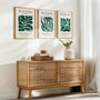Die Farbpalette ist auf ein tiefes, sattes Grün reduziert, kombiniert mit einem hellen, neutralen Hintergrund. Diese Kombination unterstreicht den ruhigen, harmonischen Charakter der Poster und lässt sie perfekt in moderne, minimalistische und naturnahe Interieurs passen.