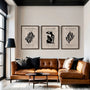 Der Kontrast von tiefem Schwarz und hellem Hintergrund verleiht den Postern zeitlose Eleganz und Ausdruckskraft. Die minimalistische Farbpalette unterstreicht den modernistischen Charakter der Arbeiten und sorgt dafür, dass das Set perfekt in moderne, loftartige und Japandi-Interieurs passt.
