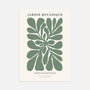 Ein minimalistisches botanisches Poster mit einem großflächigen, grafischen, salbeigrünen Blumenmotiv auf hellem Hintergrund. Organische Formen schaffen eine moderne, aber dennoch retro-inspirierte Komposition, die an einen Kunstdruck aus einer Museumssammlung erinnert. Das schlichte Layout und die beruhigenden Farben machen das Poster passend für japanische, skandinavische, Boho- und moderne Interieurs – es verleiht ihnen Charakter, ohne aufdringlich zu wirken.