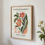 Das stilvolle Poster „Flower Market New York“ ist ein Vintage-inspiriertes Werk, das botanische Motive mit einer warmen Farbpalette aus Pfirsich-, Grün- und zarten Cremetönen kombiniert. Die moderne, geometrische Form der Blumen macht das Poster zur perfekten Ergänzung für Interieurs im Retro-, Boho-, skandinavischen oder modern-klassischen Stil. Dank seiner ausdrucksstarken Komposition wirkt es sowohl einzeln als auch in Kombination mit anderen botanischen Drucken aus der Flower-Market-Serie hervorragend.