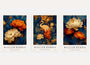 Die zweite und dritte Arbeit konzentrieren sich auf Blumen mit skulpturalen Blütenblättern, gehalten in einer Palette aus Creme, gebrochenem Weiß, intensivem Orange und tiefen Blautönen. Stilisierte Blätter formen wellenartige Ornamente, die an historische Dekorstoffe und Tapeten des späten 19. Jahrhunderts erinnern.