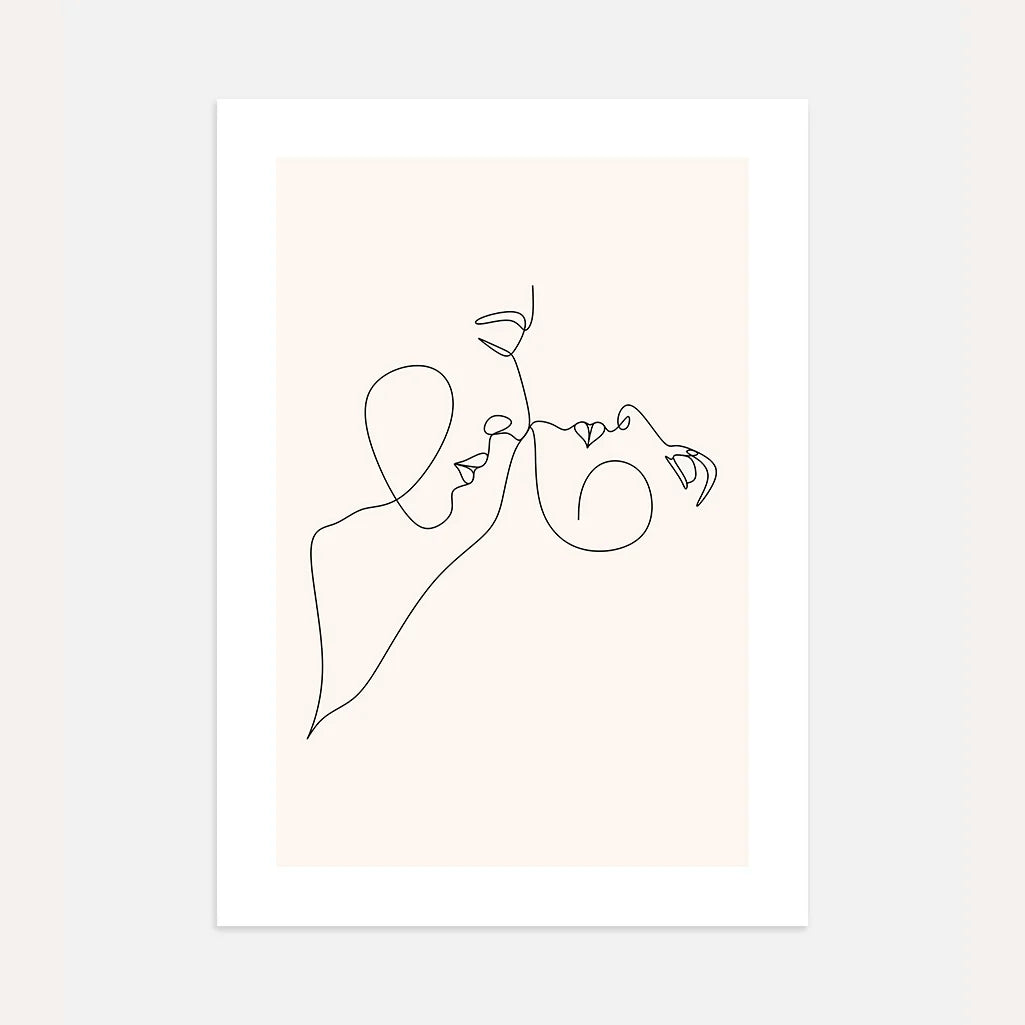 Kussende Gesichter zeigt zwei ineinanderfließende Profile, die in einer einzigen Line Art Linie verbunden sind. Die reduzierte Kontur symbolisiert Nähe, Emotion und stille Verbundenheit.