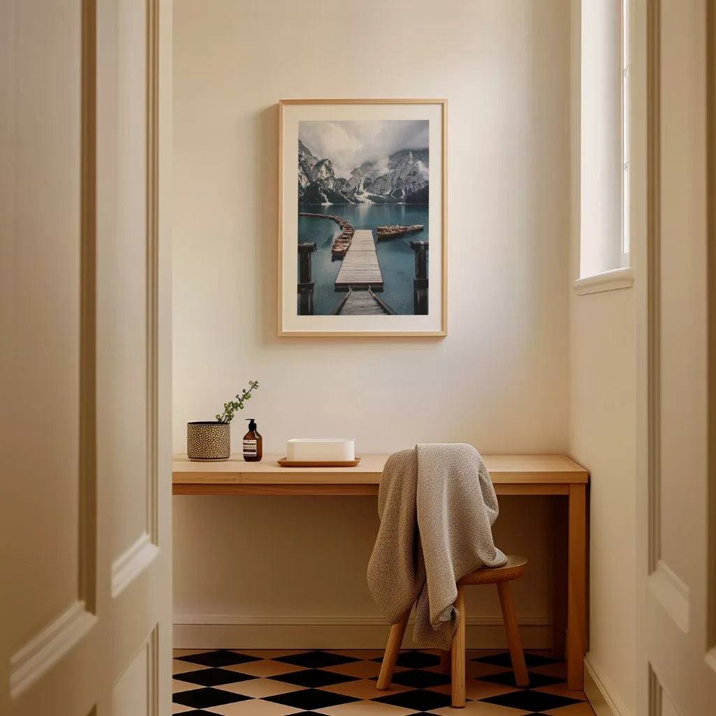 Dieses Landschaftsposter zeigt einen hölzernen Steg, der in einen ruhigen, türkisfarbenen Bergsee führt. Im Hintergrund erheben sich majestätische, schneebedeckte Gipfel, während feiner Nebel über den Bergen schwebt.